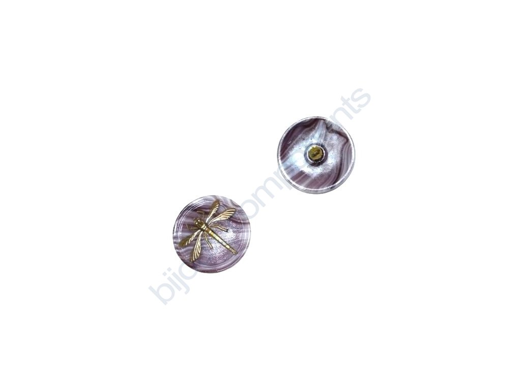 Skleněný knoflík s motivem vážky, dofialova, motiv zlatý