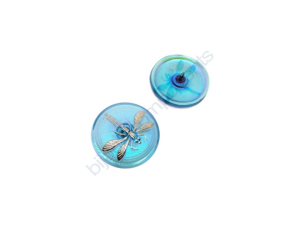 Skleněný knoflík s motivem vážky, modrý,se platinovým motivem, se spodním pokovem