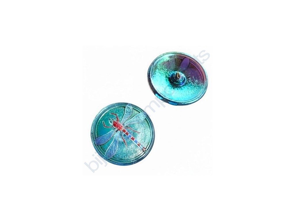 Skleněný knoflík s motivem vážky, domodra, motiv barevný, se spodním pokovem