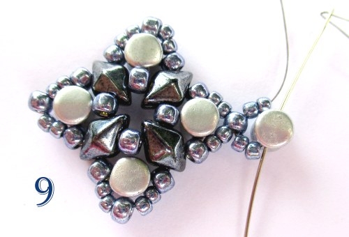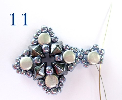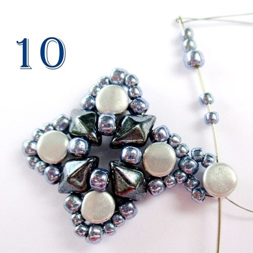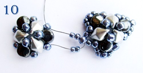 Spojování jednotlivých dílků: První dílek ušijte podle návodu krok 1-7. Druhý dílek ušijte stejně, jen u kroku 6 nepřidávejte jeden vrcholek T 8/0 a jehlu místo toho provlékněte korálem T 8/0 u prvního motivu ušitého v kroku 8 (obr. 10).