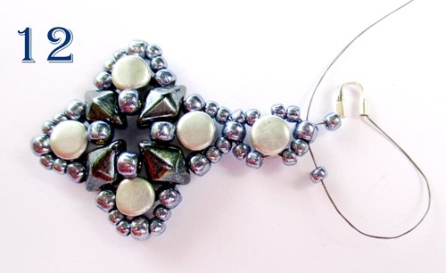 Na jehlu navlékněte 1 korálek T 11/0, podkůvku oběma otvory, 1 korálek 11/0 a jehlu provlékněte výchozím korálkem T 8/0. Tento krok pro větší pevnost ještě jednou zopakujte (obr. 12).
