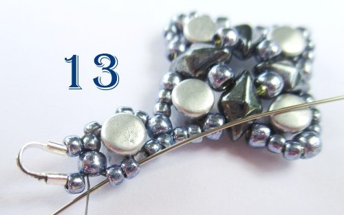 Jehlu provlékněte dvěma již ušitými korálky T 11/0 (obr. 13).