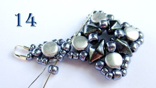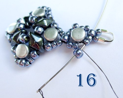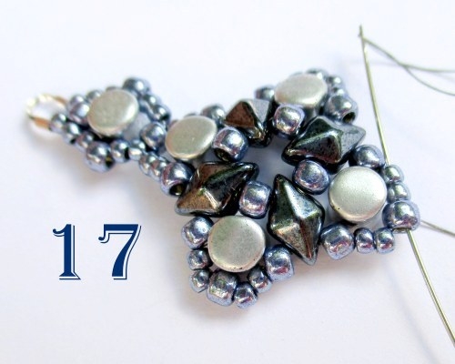 Máte ušitou náušnici, stačí už jen návlek řádně zapošít a navléknout háček. Pokud chcete šít náramek, návlek neukončujte a pokračujte následujícími kroky. Následujícími korálky přejděte do protilehlé strany motivku, jehla vám vychází z korálku T 8/0 (obr. 17).