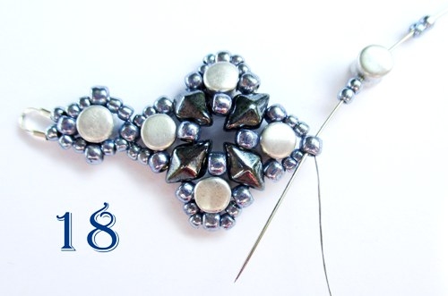 Na jehlu navlékněte 2 korálky T 11/0, 1 korálek PH, 2 korálky T 11/0 a jehlu provlékněte výchozím korálkem T 8/0 (obr. 18).