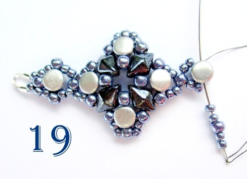 Následujícími korálky přejděte do právě ušitého korálku PH, navlékněte 2 korálky T 11/0, 1 korálek T 8/0, 2 korálky T 11/0 a jehlu provlékněte korálem PH (obr. 19).