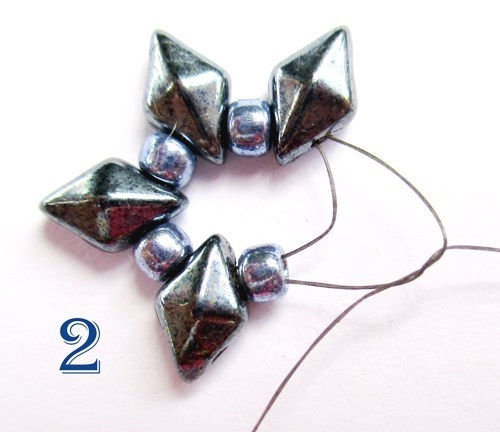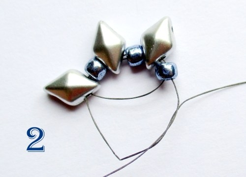 Jehlu provlékněte právě navlečenými korálky ještě jednou ve stejném pořadí, stáhněte a zafixujte dvěma až třemi uzlíky (obr. 2).
