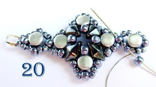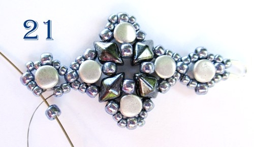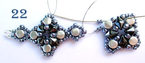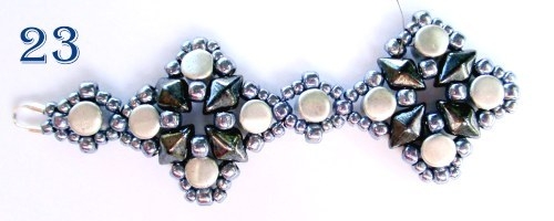 Podle bodů 1-6 ušijte další motiv, přičemž v 6. řadě šijte podle návodu 3 rohy, poté na jehlu navlékněte 2 korálky T 11/0, jehlu provlékněte korálkem T 8/0 ve špičce spojovací části, navlékněte 2 korálky 11/0 a jehlu provlékněte prvním následujícím korálkem T 8/0 u motivku. Celou poslední řadu pro větší pevnost spoje ještě jednou prošijte a návlek poté řádně zapošijte (obr. 22, 23).