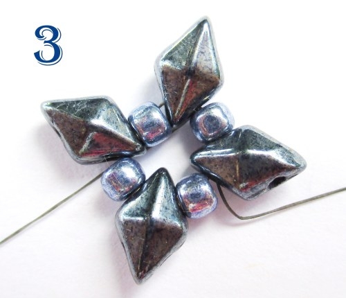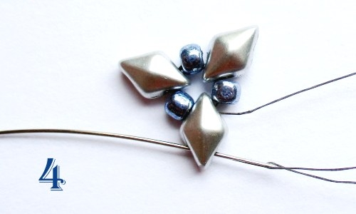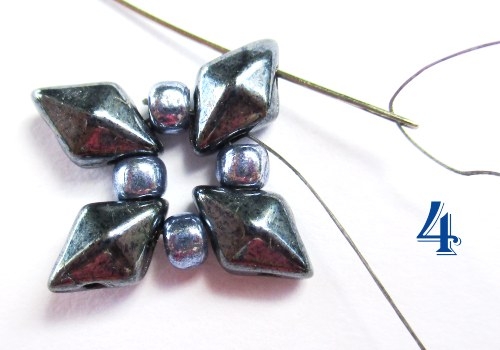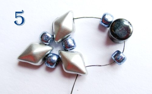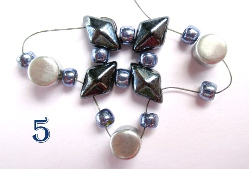 Na jehlu navlékněte 1 korálek T 8/0, 1 korálek PH, 1 korálek T 8/0 a provlékněte ji následující volnou dírkou korálku DD. To celé celkem 4x (obr. 5).
