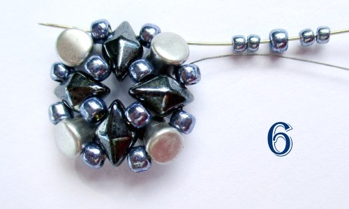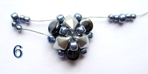 Jehlou přejděte pro zpevnění několika následujícími korálky tak, aby vám vycházela z korálku T 8/0 za korálkem DD, navlékněte 2 korálky T 11/0, 1 korálek T 8/0, 2 korálky T 11/0 a jehlu provlékněte následujícími třemi korálky, jehla Vám teď opět vychází z korálku T 8/0 za korálem DD. Postup zopakujte ještě 3x (obr. 6).