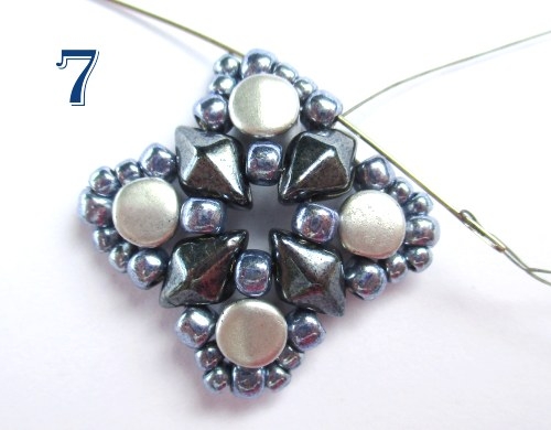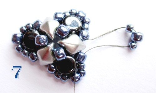 Jehlu provlékněte následujícími korálky tak, aby vycházela z korálku T 8/0 před korálkem DD, navlékněte 1 korálek T 11/0, 1 korálek T 8/0, 1 korálek T 11/0 a jehlu provlékněte korálkem T 8/0 za korálkem DD (obr. 7).