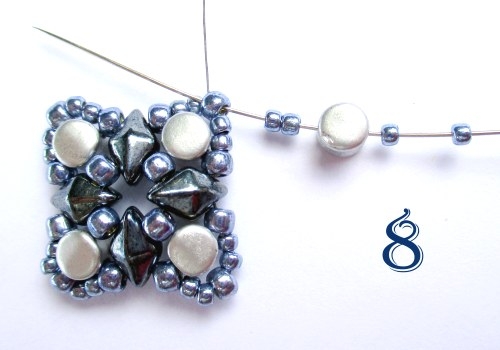 Na jehlu navlékněte 2 korálky T 11/0, 1 korálek PH, 2 korálky T 11/0 a jehlu provlékněte výchozím korálkem T 8/0 (obr. 8).