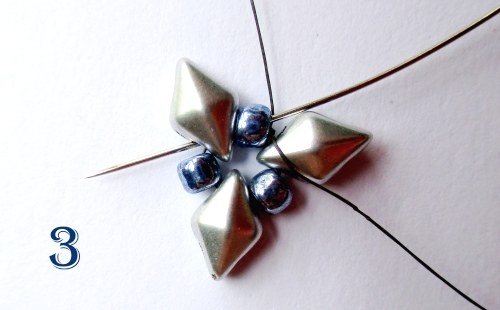 Jehlu provlékněte jedním již ušitým korálkem T 8/0 a jedním korálkem DD (obr 3).
