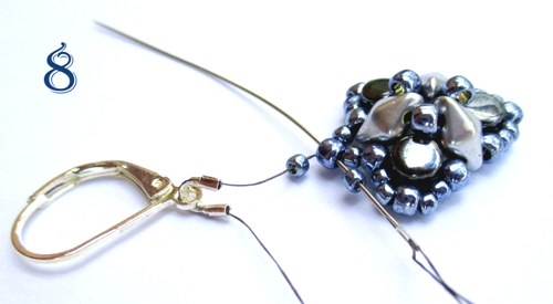 Poté jehlu prošijte všemi již ušitými korálky až do právě přišitého korálku T 8/0, navlékněte 1 korálek T 11/0, podkůvku oběma otvory, na podkůvku navlékněte náušnicový háček, pozor na směr navlečení, aby líc náušnice vycházel správně. Poté navlékněte 1 korálek T 11/0 a jehlu provlékněte předchozím korálkem T 8/0. Celou část s podkůvkou ještě jednou nebo dvakrát prošijte a poté návlek řádně zapošijte (obr. 8).