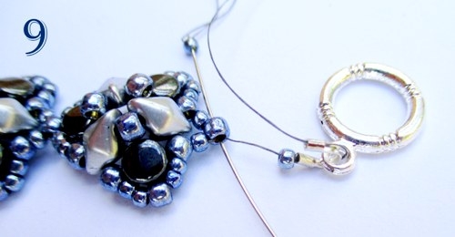 Pokud budete šít náramek, postupujte stejně a místo náušnicového háčku navlékněte 1 díl OT zapínání, nebo jen přišijte podkůvku a na ní pak připevněte karabinku pomocí očkové jehly s navlečeným korálkem nebo kroužku, postup je popsaný v návodu na náramek PLAMÍNKY (obr. 9).