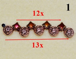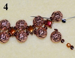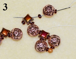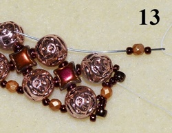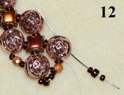 Navlečte 1x T 11/0, 1x T 8/0, 1x T 11/0 a prošijte D, O, D (obr. 11). Navlečte 1x T 11/0, 1x T 8/0, 1x T 11/0 a prošijte C vrchní dírkou (obr. 12).