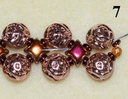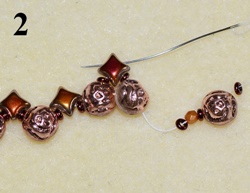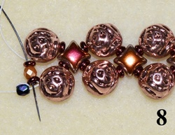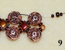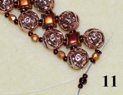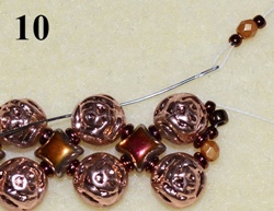 Navlečte 1x T 11/0, 1x T 8/0, 1x T 11/0 a prošijte C vrchní dírkou (obr. 9). Navlečte 1x T 11/0, 1x O, 1x T 11/0 a prošijte C vrchní dírkou (obr. 10). Postup opakujte do konce řady.