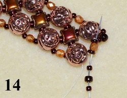 Navlečte 1x T 11/0, 1x O, 1x T 11/0 a prošijte C vrchní dírkou (obr. 13). Postup opakujte do konce řady. Navlečte 1x T 11/0, 1x T 8/0, 1x T 11/0 a prošijte D, O, D (obr. 14). Všechny naposledy přidané korálky prošijte po obvodu ještě jednou pro větší zpevnění.